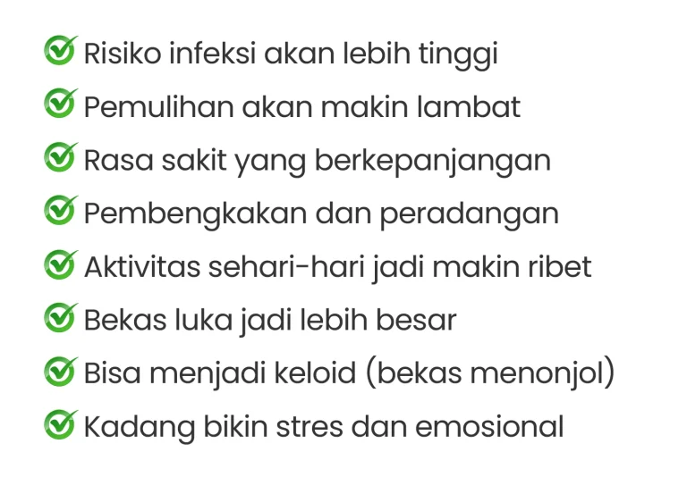 Jika luka atau jahitan pasca operasi lama kering, itu bisa membawa beberapa akibat negatif baik dari segi kesehatan maupun dalam kehidupan sehari-hari.